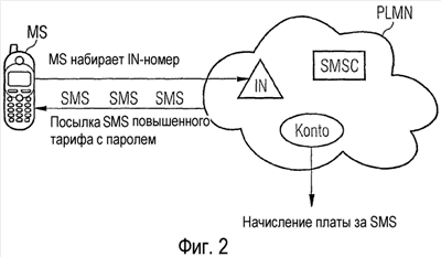 На фиг.2 схематично показан процесс, осуществляемый между мобильной станцией MS и сетью мобильной связи PLMN. Мобильная станция MS выбирает соответствующий номер интеллектуальной сети IN, которая является составной частью сети PLMN мобильной радиосвязи (MS выбирает IN-номер). После этого сеть PLMN мобильной радиосвязи посылает мобильной станции MS SMS-сообщение по повышенному тарифу, которое содержит действительный пароль для сети WLAN (передача SMS-сообщения по повышенному тарифу с паролем). В пересылке SMS-сообщения участвует устройство SMSC (Центр службы коротких сообщений). Устройство SMSC обеспечивает доставку коротких сообщений и пересылает информацию о начислении платы за короткие сообщения в систему начисления платы сети PLMN мобильной радиосвязи. Сеть PLMN мобильной радиосвязи ведет счет активов KONTO для пользователя. С этого счета активов KONTO списывается платеж, приходящийся на SMS-сообщение по повышенному тарифу (начисление платы за SMS).