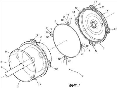 Корпус 2, в свою очередь, содержит чашеобразную часть 5 и крышку 6, которые соединяют одну с другой соединительными приспособлениями известного типа, и по этой причине они не показаны здесь более подробно.