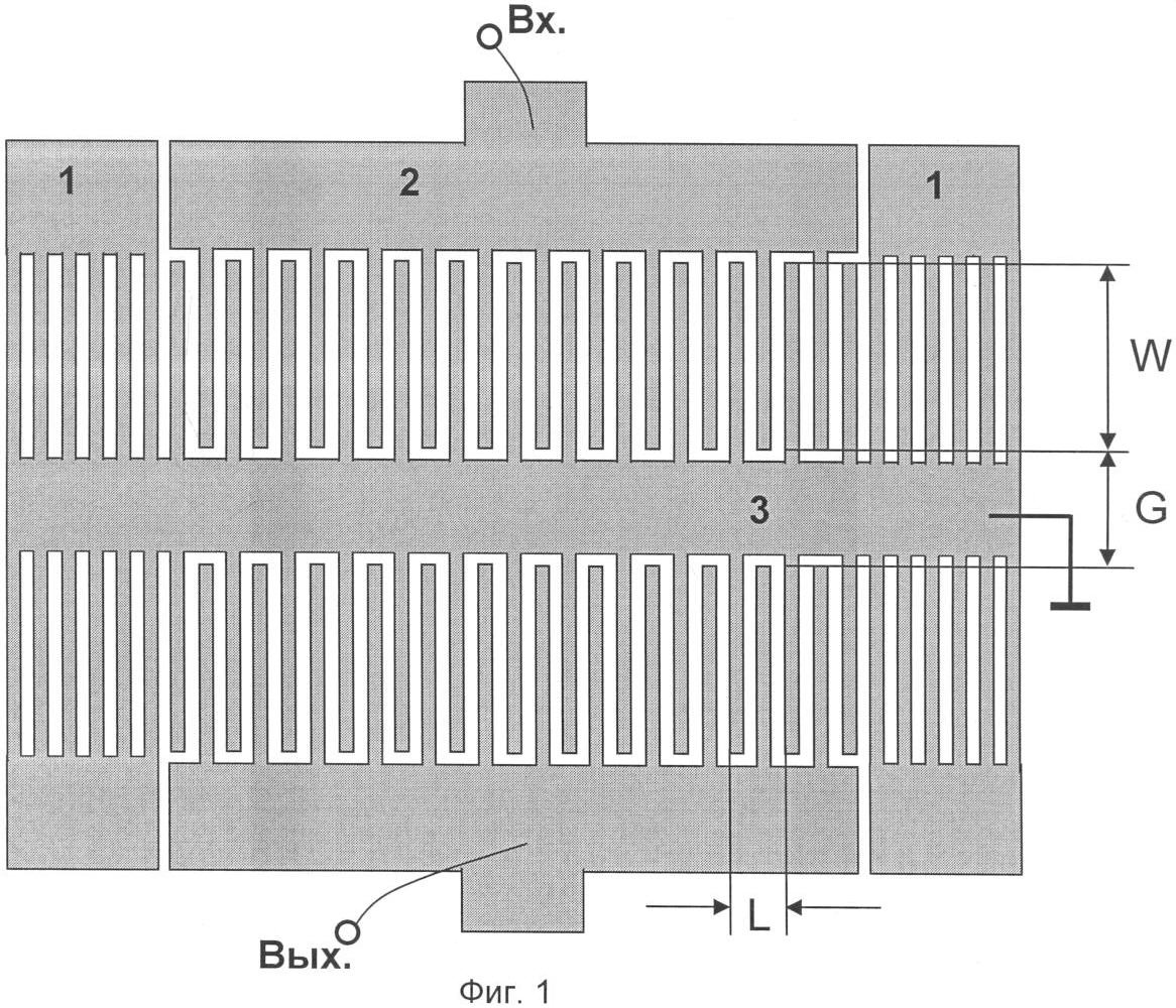 Отличительным признаком заявляемого изобретения является то, что заземленная шина связи двухмодового резонатора выполнена в виде меандра. При этом апертура W дискретно меняется с периодом 2L, принимая значения W1, либо W2. Вследствие этого увеличивается поперечная связь между симметричной и антисимметричной модами [1], и соответственно увеличивается относительная полоса пропускания фильтра.