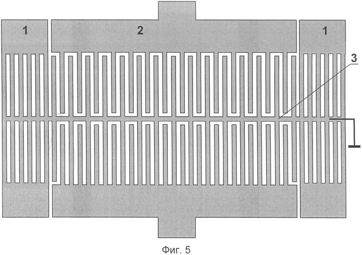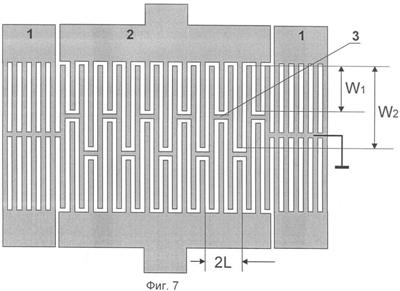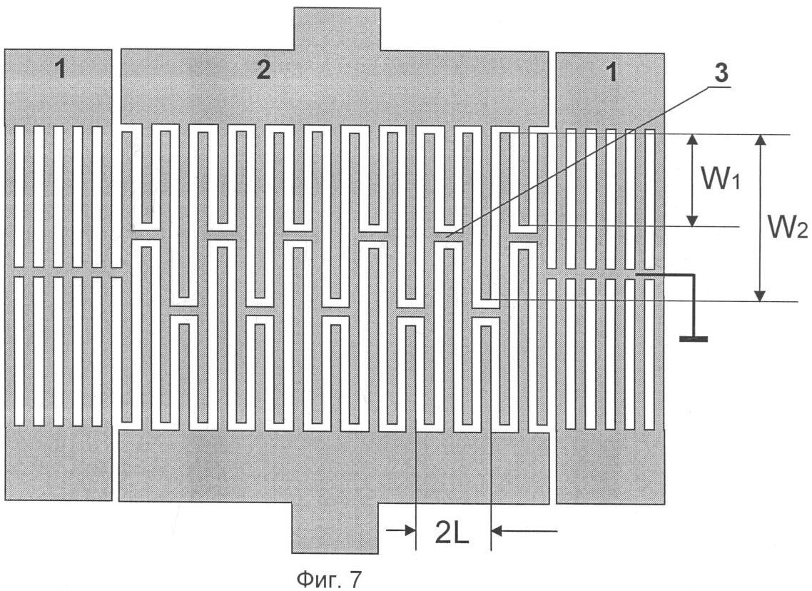 Фиг.7. Топология двухмодового резонатора с заземленной шиной связи в виде меандра (с периодически меняющейся апертурой) для фильтра с относительной полосой пропускания 0,15%.