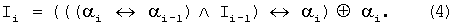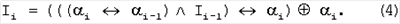 Как видно из (4), промежуточный результат текущего такта получен в виде рекуррентного соотношения. Далее одновременно логически перемножают поступивший на данном такте бит i и промежуточный результат данного такта Ii (4), инвертируют поступивший на данном такте бит i, и логически перемножают результат инверсии с промежуточным результатом данного такта Ii (4), инвертируют промежуточный результат данного такта Ii (4):