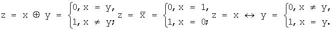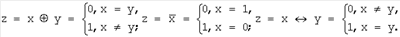 Для логических операций использованы следующие обозначения и терминология: символ « » означает логическое суммирование (дизъюнкция – ИЛИ), символ « » – логическое умножение (конъюнкция – И), символ « » – суммирование по модулю два (исключающее ИЛИ), символ « » – отрицание (инверсия – НЕ) и символ « » – сравнение (последовательность операций: исключающее ИЛИ-НЕ).