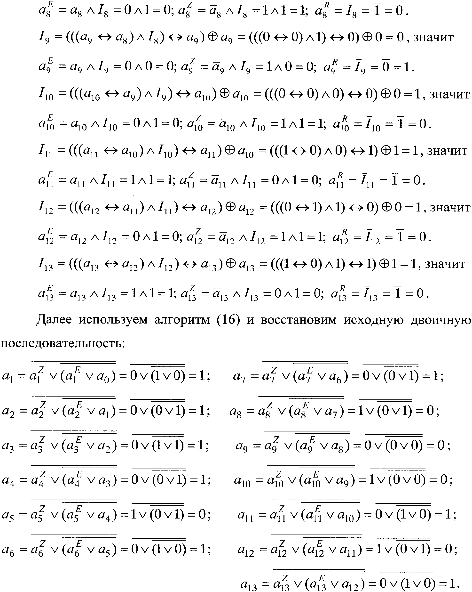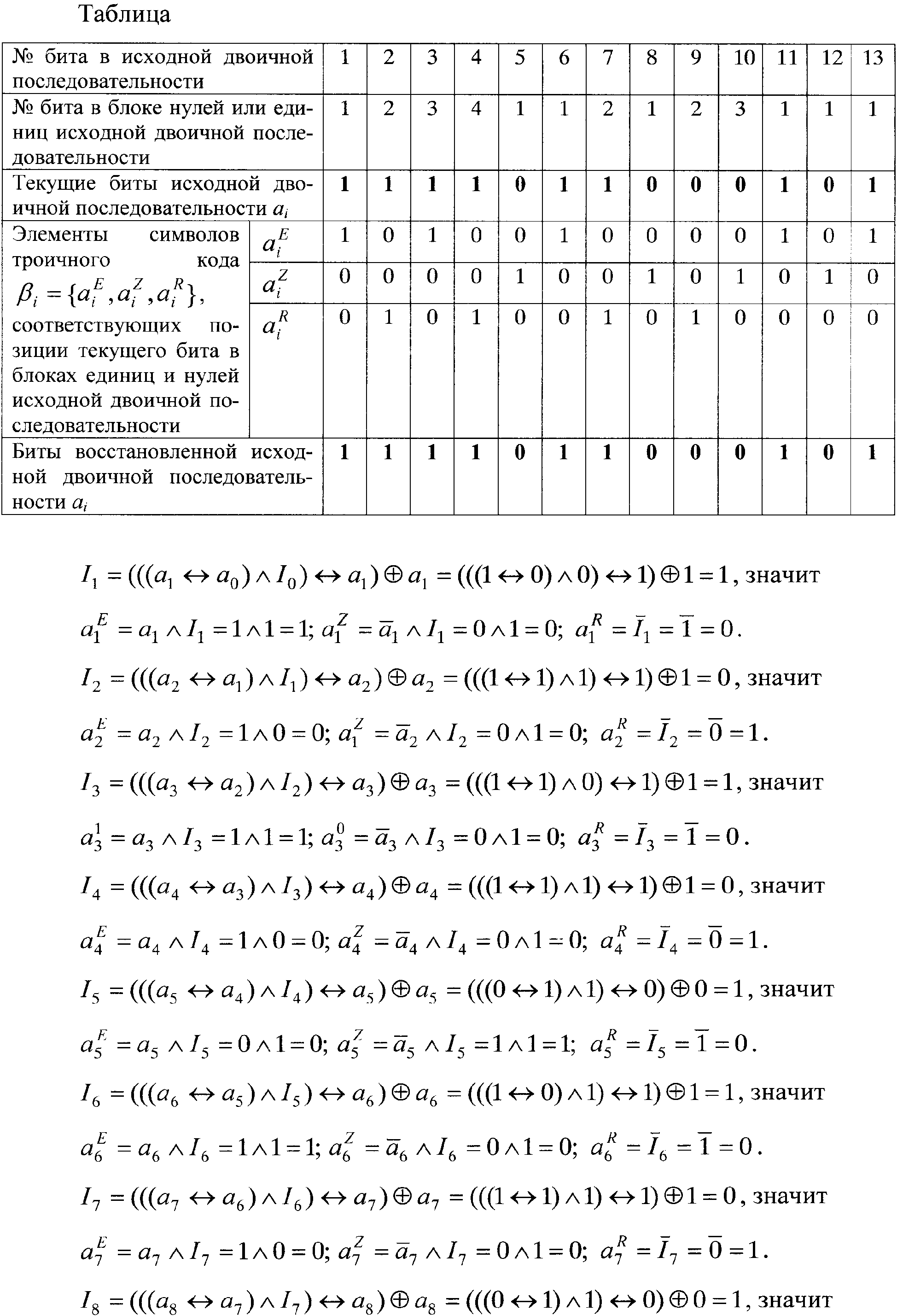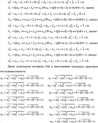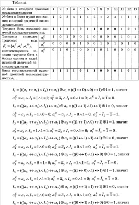 Далее преобразуют символы троичного кода в двоичные символы (биты), для чего из каждого символа троичного кода выделяют его элементы , , , представляющие собой биты, из которых одновременно формируют три двоичные последовательности , , , …, , …, , , , …, , … и , , , …, , …. Единицы в первой и второй двоичных последовательностях соответствуют битам исходной двоичной последовательности, стоящим на нечетных позициях в блоках единиц и нулей соответственно; единицы в третьей двоичной последовательности соответствуют битам исходной двоичной последовательности, стоящим на четных позициях в блоках единиц и в блоках нулей. Две первые двоичные последовательности используют для восстановления исходной двоичной информации. Для этого над битами из двоичных последовательностей , , , …, , … и , , , …, , … осуществляют следующие операции. На произвольном такте текущий бит первой полученной двоичной последовательности логически суммируют с исходным информационным битом, восстановленным на предыдущем такте i-1