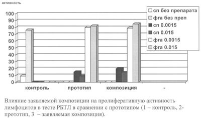 Из графика хорошо видно, что заявляемая композиция в изученных концентрациях оказывает стимулирующее действие на спонтанную активность лимфоцитов в диапазоне 30-55% относительно прототипа и до 120% относительно контроля. Кроме того, видно, что заявляемая композиция не оказывает угнетающего действия на индуцированную ФГА пролиферативную активность лимфоцитов.