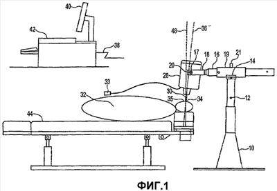 Убирающийся щуп 30 выступает из головки аппарата 28, и его конечная точка 34 используется для подачи импульсов в заданную точку контакта 35 на теле 32 пациента. Точка контакта 35 может находиться на верхнем шейном позвонке, сзади уха, как показано на фиг.1. Пациент 32 лежит на кушетке 44, и требуемая точка контакта 35 находится в неподвижном положении. Комбинация множества компонентов и степеней свободы головки 28 устройства, описанных выше, позволяет позиционировать линейную ось 36 головки 28 аппарата и убирающийся щуп 30 в любом направлении в трех измерениях, одновременно удерживая конец 34 щупа в заданном неподвижном положении в трех измерениях. Для терапевтического воздействия это неподвижное место является точкой контакта 35 на теле 32 пациента.