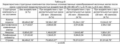 | Показатели структурных компонентов спонтанной злокачественной опухоли молочной железы после курса воздействия ЗИИ ЭМП с параметрами воздействия В=(40÷80) мТл; tи=0,75 сек.; tп=0,5 сек; Твоздействия=(30 мин·40 сеансов) |
