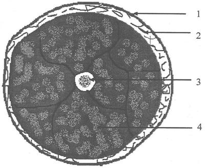 Форма поперечного сечения плеча, предплечья, бедра, голени близки к кругу. Поэтому их общую площадь поперечного сечения можно рассчитать как площадь круга. В ее состав входит площадь анатомического поперечника мышц, площадь поперечного сечения кости, площадь кожи и подкожно-жировой клетчатки на этом уровне (см. чертеж). После расчета площади кожи с подкожно-жировой клетчаткой и вычитания ее из общей площади поперечного сечения получается площадь анатомического поперечника мышц и площадь поперечного сечения кости. Площадью поперечного сечения кости в оценке эффективности силовой тренировки можно пренебречь, так как она за это время не претерпевает существенных изменений.