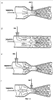 На фиг.4 показаны картины диспергирования газа и его равномерного распределения после прохождения газожидкостной смеси через трубу Вентури (фиг.4, а), через крыльчатку (фиг.4, б) и через трубу Вентури с крыльчаткой при вводе газа перед крыльчаткой (фиг.4, в) и при вводе газа в горловину (фиг.4, г). Стрелками изображены характерные линии тока жидкости, форма которых способствует растяжению и дроблению исходных пузырей, и последующему распределению полученных мелкодисперсных пузырей по поперечному сечению аппарата.