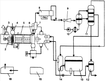 – разгрузочное устройство (6) связано с осадительной камерой (7), снабженной аппаратом воздушного охлаждения (8) и жидкоструйной компрессорной установкой, предназначенной для перекачивания жидкой и газообразной фаз под давлением выше атмосферного, как минимум, на 1-2 атм;
