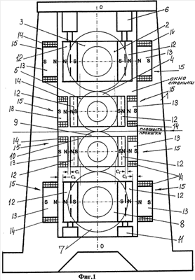 Наружные поверхности постоянных магнитных плит 12 выполнены плоскими или в форме вогнутых линз, с фокусами, лежащими на одной оси с центрами тяжести валковых узлов (не показаны), или постоянные магнитные плиты 12 выполнены в виде отдельных секций, коаксиально установленных относительно друг друга. Напротив них, на внутренних вертикальных плоскостях окна станины 1 установлены магнитные плиты 13, охваченные катушками нейтрализации 14 или электромагниты 15. Постоянные магнитные плиты 12 и 13 или электромагниты 15 установлены по отношению друг другу одноименными полюсами по схемам «S-S» или «N-N» с возможностью принятия подушками 3, 5, 8, 10 нейтрального положения, и, в этом случае, подушки 3, 5, 8, 10 валков 2, 4, 7, 9 устанавливаются в одной плоскости O-O, перпендикулярной плоскости прокатки, или будучи установленными одноименными и разноименными полюсами по схемам «S-S» и «N-S» или «N-N» и «S-N» перемещаются в одну или разные стороны по отношению к внутренним вертикальным плоскостям окна станины 1, с эксцентриситетом С3.