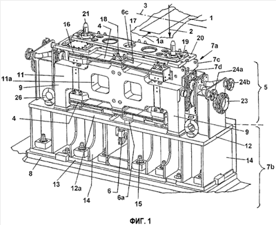 На фиг.4 показан нижний узел 7b при полностью снятом узле 7. Сняты, среди прочего, направляющие элементы 4 и зажимные плиты 16, винты 18, выполненная в виде одной части стенная балка 11 с опорными блоками 9, закрывающая плита 19, опорная плита 20 с направляющими шипами 21. Как показано на фиг.4, открывается простой доступ к механизму 6 качания с цилиндропоршневыми блоками 6а. Цилиндропоршневые блоки 6а можно извлекать наверх и снова монтировать в обратном порядке.