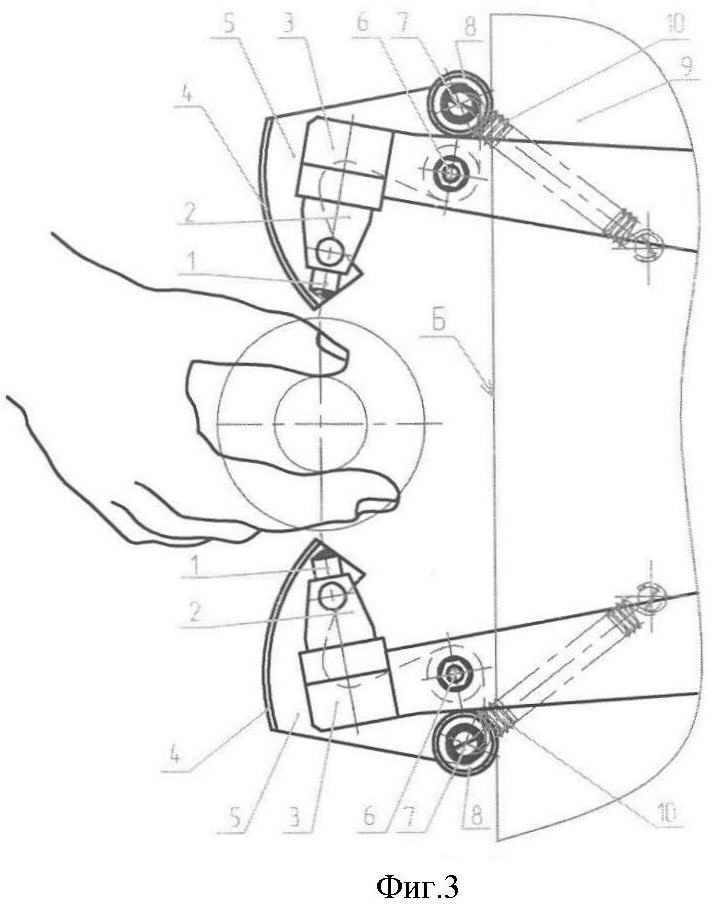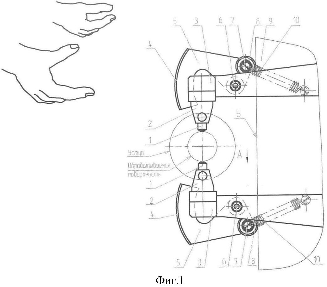 Перед загрузкой изделия в базирующие элементы станка (например, в цанговый патрон и центр) рычаги 3 с инструментами разводятся приводом рычагов. Пружина 10, прижимая ролик 8 к неподвижному торцу Б корпуса 9, заставляет его перекатываться по торцу Б и поворачивать боковую сторону 5 экрана относительно оси 6. В результате защитная часть 4 смещается таким образом, что она прикрывает инструменты и защищает их от возможного повреждения как самой поверхностью, подлежащей обработке, так и соседними поверхностями, например, расположенным рядом уступом. Когда привод рычагов 3 подводит инструменты к обрабатываемой поверхности, экраны смещаются, открывая инструменты, как показано на фиг.1.