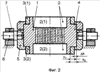 Матрица во втором варианте ее конструкции (фиг.2) также выполнена сборно-разборной и отличается от первого варианта тем, что вместо одного она содержит два бандажного кольца 3(1) и 3(2), а также тем, что боковой кольцевой выступ 4 выполнен на наружной боковой поверхности решетки 1 в ее средней части. При этом радиальный размер из выступа 4 превышает толщину h1 стенки любого бандажного кольца 3(1) или 3(2) на величину h выступающей за его наружный диаметр части. Этой выступающей частью ( h) выступ 4 закреплен в обойме 5, а упомянутые бандажные кольца 3(1) и 3(2) выполнены одинаковыми и расположены с разных сторон радиального кольцевого выступа 5. При этом для каждого бандажного кольца 3(1) или 3(2) один его торец сопряжен с соответствующей плоскостью радиального кольцевого выступа 4, а другой его торец расположен в плоскости соответствующего торца решетки 1. Это обусловлено необходимостью взаимодействия матрицы с другими элементами установки бародеструкционной переработки.
