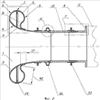 Вариант исполнения воздухозаборника 1 заключается в следующем. Внешний обтекатель 5 выполнен с плавным переходом своей аэродинамической поверхностью 6 к наружной поверхности внутреннего обтекателя 3 с изменением направления кривизны в точке 43 перегиба и ее увеличением до зоны скрепления 44 в точке замыкания 45 петли, причем исследованиями установлено, что увеличение кривизны после перегиба от r1=(0,2-0,5)b до r2=(0,035-0,065)b, где b – ширина петли 8, обеспечивает оптимальное наложение вибраций оболочек по направлению и частоте с максимальным эффектом их гашения.