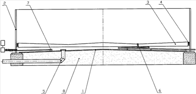 Для получения дополнительного объема для нефтепродуктов резервуар установлен на фундамент 8. Для увеличения вертикального перемещения плавающей крыши приемо-раздаточное устройство 5 размещено внутри фундамента 8 ниже горизонтальной плоскости, проходящей через основание конуса днища 1.