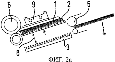 Помимо этого, по сравнению с показанной на фиг.5 опорная поверхность 14, показанная на фиг.6, может быть также размещена с возможностью поворачиваться вокруг оси 19 и предпочтительно смещаться также в перпендикулярном направлении. В этом случае в результате вхождения зубцов гребенки 2 в углубления подающего элемента 3 опорная поверхность 14 поворачивается, а также отжимается вниз (см. фиг.6б).