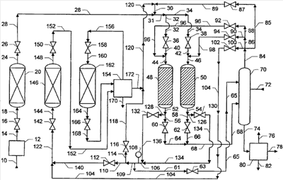 В бензольную колонну 70 поток компенсирующего расход бензола подают в линии 72. Дистиллятная система бензольной колонны 70 может включать водосборник или другие обычно используемые установки для удаления воды из технологического процесса, поскольку поток компенсирующего расход бензола может быть влажным. Бензол извлекают из верхней части бензольной колонны 70. Чертеж демонстрирует данный бензол, перепускаемый в виде одного потока через линию 84, вместе с линиями и клапанами, которые делают возможным использование частей данного бензола для четырех различных вариантов использования в технологическом процессе. Во-первых, имеется бензол, отправляемый на рецикл в действующий реактор (через линию 85, клапан 87 и линию 89). Во-вторых, регенерирующий бензол используют для ректора 48, если реактор 48 является бездействующим (через линии 86 и 88, клапан 92 и линию 96). В-третьих, регенерирующий бензол доступен для реактора 50, если реактор 50 является бездействующим (через линии 86 и 90, клапан 94 и линию 98). В заключение, бензол можно использовать для проведения десорбирования для бездействующего слоя 146 (через линию 100, клапан 102 и линию 104).