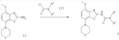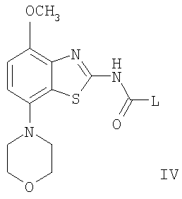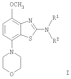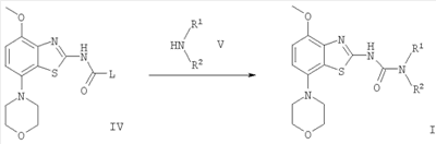 где R1 и R2 являются такими, как определено выше, L означает уходящую группу, такую как галоген, -O-фенил или O-низший алкил, и, если необходимо, превращение полученных соединений в фармацевтически приемлемые кислотно-аддитивные соли. В примерах 1-13 и на приведенных ниже схемах 1 и 2 получение соединений формулы I описано более подробно. Исходные вещества, которые представляют собой известные соединения, могут быть получены в соответствии с методиками, известными из предшествующего уровня техники. Получение соединений формулы I Промежуточное соединение 7-(морфолин-4-ил)-4-метоксибензотиазол-2-иламин (II) может быть получено в соответствии с методиками, раскрытыми в опубликованной международной заявке WO 01/97786. Получение соединений формулы (I) с использованием промежуточного соединения формулы (II) также описано в опубликованной международной заявке WO 01/97786. Один из способов получения соединений формулы (I) осуществляют в соответствии со схемой 1 следующим образом: к раствору соединения формулы (II) в дихлорметане последовательно добавляют основание, например, такое как пиридин или диизопропилэтиламин, и соединение формулы (III), затем полученный раствор перемешивают в течение приблизительно 45 мин при температуре окружающей среды. Добавляют насыщенный водный раствор бикарбоната натрия, полученную органическую фазу разделяют и высушивают. Схема 1 R1 и R2 являются такими, как описано выше. Другой способ получения соединений формулы (I) осуществляют следующим образом: к раствору производного соединения формулы (IV), которое может быть получено в соответствии с методиками, хорошо известным из предшествующего уровня техники и которые описаны в опубликованной международной заявке WO 01/97786, в инертном растворителе, например, таком как дихлорметан, последовательно добавляют основание, например, такое как пиридин или диизопропилэтиламин, и соединение формулы (V), затем полученный раствор перемешивают в течение приблизительно 45 минут при 45°С. После охлаждения до температуры окружающей среды добавляют насыщенный водный раствор бикарбоната натрия, полученную органическую фазу отделяют и высушивают. Схема 2 R1 и R2 являются такими, как описано выше, L означает уходящую группу, такую как галоген, -O-фенил или -O-низший алкил. Выделение и очистка соединений Выделение и очистка соединений и промежуточных соединений, описанных в тексте настоящей заявки, могут быть выполнены, если необходимо, с использованием любой подходящей методики разделения или очистки, например, такой как фильтрация, экстракция, кристаллизация, колоночная хроматография, тонкослойная хроматография, хроматография в толстом слое, препаративная хроматография низкого или высокого разрешения или жидкостная хроматография при высоком давлении, или с использованием комбинации этих методик. Конкретные иллюстрации использования подходящих методик разделения и выделения можно найти в разделе, посвященном синтезу и примерам конкретного выполнения ниже в тексте настоящей заявки. Однако, безусловно, могут быть использованы и другие эквивалентные методики разделения и выделения. Соли соединений формулы I Соединения формулы I могут быть основного характера, например, в тех случаях, когда остаток R содержит группу основного характера, например такую, как фрагмент алифатического или ароматич