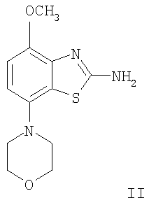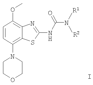 Методика приготовления 1. Смешивают соединения по позициям 1, 2 и 3 в подходящем смесителе в течение 30 минут. 2. Добавляют соединения согласно позициям 4 и 5 и смешивают в течение 3 минут. 3. Помещают в подходящие капсулы. Приведенные ниже подготовительные примеры и примеры служат только для иллюстрации изобретения и, как предполагается, не ограничивают объем настоящего изобретения. Пример 1 3-(4-Метокси-7-морфолин-4-ил-бензотиазол-2-ил)-1-метил- 1-(4-трифторметилциклогексил)мочевина 4-Метокси-7-морфолин-4-ил-бензотиазол-2-иламин сначала подвергают взаимодействию с фенилхлороформиатом таким образом, как описано в отношении бензилового эфира (4-метокси-7-фенил-бензотиазол-2-ил)карбаминовой кислоты в опубликованной международной заявке WO 01/97786 и затем с метил-(4-трифторметилциклогексил)амином. После обычного выделения, экспресс-хроматографии (силикагель, элюент – смесь дихлорметан/метанол) и окончательного упаривания растворителя получают указанное в заголовке соединение в виде белых кристаллов (выход 96%), т.пл. 157-167°С. Масс-спектр: m/e=473(M+H+). В соответствии с общей методикой, описанной в примере 1, получают соединения согласно примерам 2-12. Пример 2 (транс)-3-(4-Метокси-7-морфолин-4-ил-бензотиазол-2-ил)-1-метил-1-(4-метилциклогексил)мочевина Используя 4-метокси-7-морфолин-4-ил-бензотиазол-2-иламин, фенилхлороформиат и (транс)-метил-(4-метилциклогексил)амин, указанное в заголовке соединение получают в виде не совсем белых кристаллов (выход 70%), т.пл. 171-173°С. Масс-спектр: m/e=420(M+H+). Пример 3 (транс)-1-(4-Гидроксиметилциклогексил)-3-(4-метокси-7-морфолин-4-ил-бензотиазол-2-ил)-1-метилмочевина Используя 4-метокси-7-морфолин-4-ил-бензотиазол-2-иламин, фенилхлорформиат и (транс)-(4-гидроксиметилциклогексил)метиламин, указанное в заголовке соединение получают в виде светло-коричневых кристаллов (выход 42%). Масс-спектр: m/e=436(M+H+), т.пл. 190°С (с разл.). Пример 4 (транс)-1-(4-Метоксиметилциклогексил)-3-(4-метокси-7-морфолин-4-ил-бензотиазол-2-ил)-1-метилмочевина Используя 4-метокси-7-морфолин-4-ил-бензотиазол-2-иламин, фенилхлорформиат и (транс)-(4-метоксиметилциклогексил)метиламин, указанное в заголовке соединение получают в виде белого твердого вещества (выход 73%), т.пл. 141-143°С. Масс-спектр: m/е=450(M+H+). Пример 5 (рац),(цис)-1-(3-Гидроксиметилциклопентил)-3-(4-метокси-7-морфолин-4-ил-бензотиазол-2-ил)-1-метилмочевина Используя 4-метокси-7-морфолин-4-ил-бензотиазол-2-иламин, фенилхлорформиат и (рац)-(цис)-(3-метиламиноциклопентил)метанол, указанное в заголовке соединение получают в виде светло-желтого твердого вещества (выход 58%), т.пл. 115-118°С. Масс-спектр: m/е=421(М+Н+). Пример 6 1-(эндо)-(рац)-Бицикло[2,2,1]гепт-2-ил-3-(4-метокси-7-морфолин-4-ил-бензотиазол-2-ил)-1-метилмочевина Используя 4-метокси-7-морфолин-4-ил-бензотиазол-2-иламин, фенил хлороформиат и (эндо)-(рац)-(бицикло[2,2,1]гепт-2-ил)метиламин, указанное в заголовке соединение получают в виде белого твердого вещества (выход 65%), т.пл. 199-202°С. Масс-спектр: m/е=417(M+H+). Пример 7 (экзо)-(+)-3-(4-Метокси-7-морфолин-4-ил-бензотиазол-2-ил)-1-метил-1-(7-окса-бицикло[2,2,1]гепт-2-ил)мочевина Используя 4-метокси-7-морфолин-4-ил-бензотиазол-2-иламин, фенилхлорформиат и (-)-(экзо)метил-(7-оксабицикло[2,2,1]гепт-2-ил)амин, указанное в заголовке соединение получают в виде светло-желтых кристаллов (выход 82%), т.пл. 202-204°С. Масс-спектр: m/e=419(M+H+). Пример 8 (экзо)-(-)-3-(4-Метокси-7-морфолин-4-ил-бензотиазол-2-ил)-1-метил-1-(7-окса-бицикло[2,2,1]геп