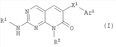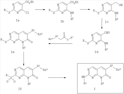 Настоящее изобретение относится к пиридопиримидинам и их производным. В частности, настоящее изобретение относится к 2,6-дизамещенным 7-оксо-пиридо[2,3-d]пиримидинам, к способу их получения, содержащим их фармацевтическим препаратам и к способам их применения. Активированные митогеном протеинкиназы (АМП) представляют собой группу управляемых пролином серин/треонинкиназ, которые активируют свои субстраты путем двойного фосфорилирования. Киназы активируются множеством сигналов, включая обусловленные питательным и осмотическим стрессом, ультрафиолетовым излучением, факторами роста, эндотоксином и воспалительными цитокинами. Одной группой АМП киназ является группа киназ р38, которая включает различные изоформы (например, р38 Важнее, что было показано, что продукты фосфорилирования р38 опосредуют продуцирование воспалительных цитокинов, включая TNF и IL-1, и циклооксигеназы-2. Каждый из этих цитокинов участвует в многочисленных заболеваниях и патологических состояниях. Например, TNF- TNF также участвует в вирусных инфекциях, таких как ВИЧ, вирус гриппа и вирус герпеса, включая, наряду с другими, вирус простого герпеса типа 1 (ВПГ-1), вирус простого герпеса типа 2 (ВПГ-2), цитомегаловирус (ЦМВ), вирус ветряной оспы (ВВО), вирус Эпштейна-Барра, вирус 6 герпеса человека (ВГЧ-6), вирус 7 герпеса человека (ВГЧ-7), вирус 8 герпеса человека (ВГЧ-8), ложное бешенство и ринотрахеит. Аналогичным образом, IL-1 продуцируется активированными моноцитами и макрофагами и играет роль во многих патофизиологических реакциях, включая ревматоидный артрит, лихорадку и снижение резорбции костей. Кроме того, обнаружено участие р38 в ударе, болезни Альцгеймера, остеоартрите, повреждении легких, септическом шоке, ангиогенезе, дерматите, псориазе и атопическом дерматите. J. Exp.Opin. Ther. Patents, 2000, 70(1). Ингибирование этих цитокинов путем ингибирования киназы р38 благоприятно при лечении, ослаблении и облегчении протекания многих из этих патологических состояний. В публикации WO 96/34867 некоторые 6-арилпиридо[2,3-d]пиримидин-7-оны, -7-имины и -7-тионы описаны как ингибиторы опосредуемой протеинтирозинкиназой пролиферации клеток. В публикации WO 96/15128 другие 6-арилпиридо[2,3-d]пиримидины и нафтиридины также описаны как ингибиторы протеинтирозинкиназы. В публикации WO 98/33798 6-алкилпиридо[2,3-d]пиримидин-7-оны описаны как ингибиторы циклинзависимых киназ. В заявке ЕР 0278686 А1 некоторые 4-амино-пиридопиримидины описаны как ингибиторы дигидрофолатредуктазы. В одном варианте осуществления настоящее изобретение относится к соединениям формулы I в которой Х1 обозначает О, С=O или S(O)n, где n равно 0, 1 или 2; Ar1 обозначает арил или гетероарил; R1 обозначает алкоксиалкил, алкил, циклоалкил, циклоалкилалкил, гетероциклил, гидроксиалкил или гидроксициклоалкил и R2 обозначает гидроксиалкил, оксоалкил или гидроксициклоалкил. Хотя по данным ферментативного анализа in vitro известно, что некоторые замещенные пиридо-7-пиримидин-7-оны активны по отношению к р38 (см., например, патент US-2003-0171584-А1, который во всей своей полноте включен в настоящее изобретение в качестве ссылки), автор настоящего изобретения неожиданно и непредвиденно установил, что при анализе вызванного липополисахаридом (ЛПС) продуцирования цистеина в цельной крови человека соединения формулы I обладают значительно большей активностью, чем соединения, опи