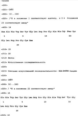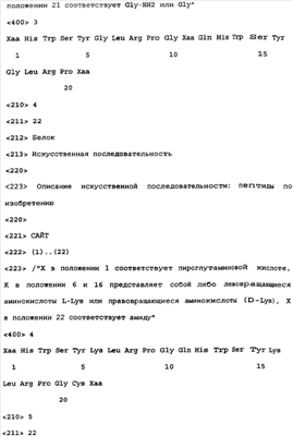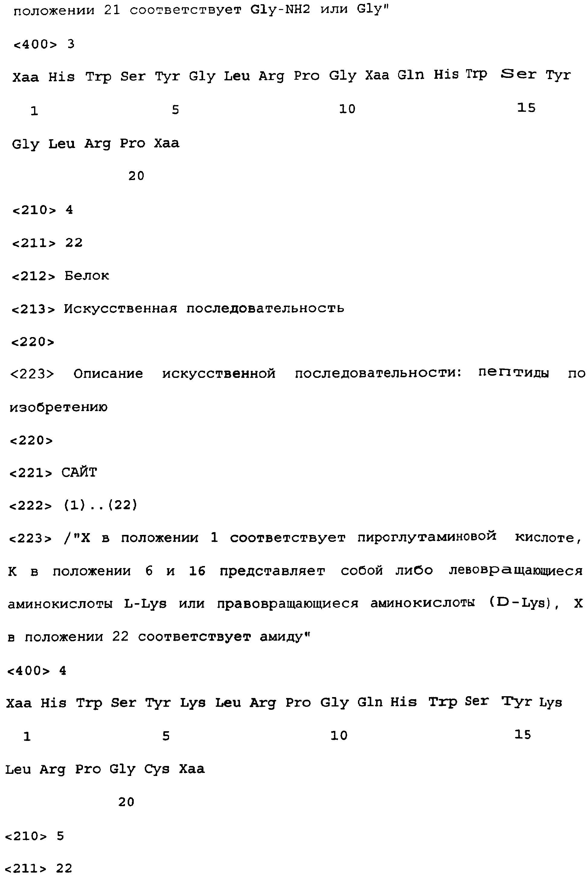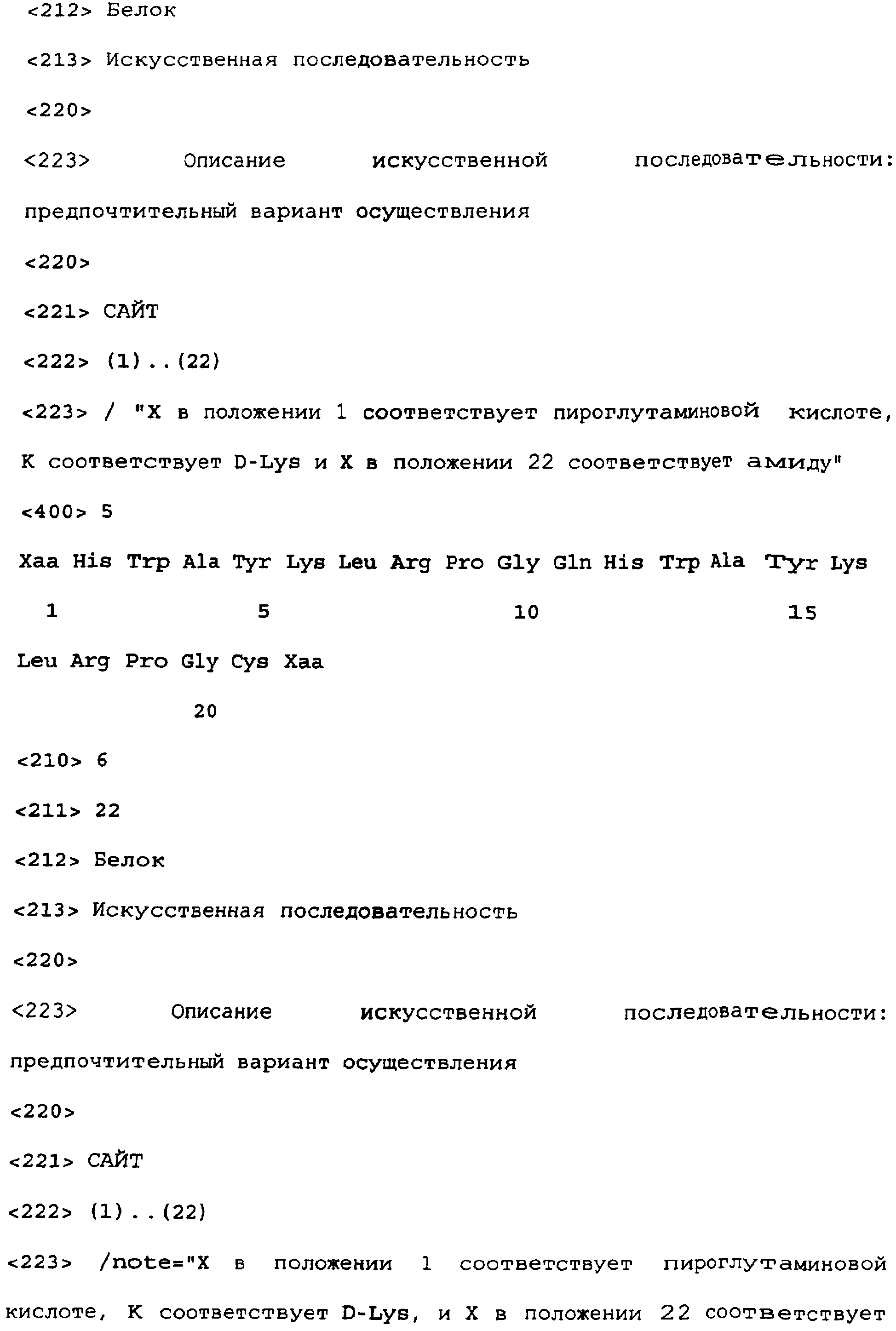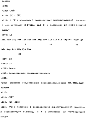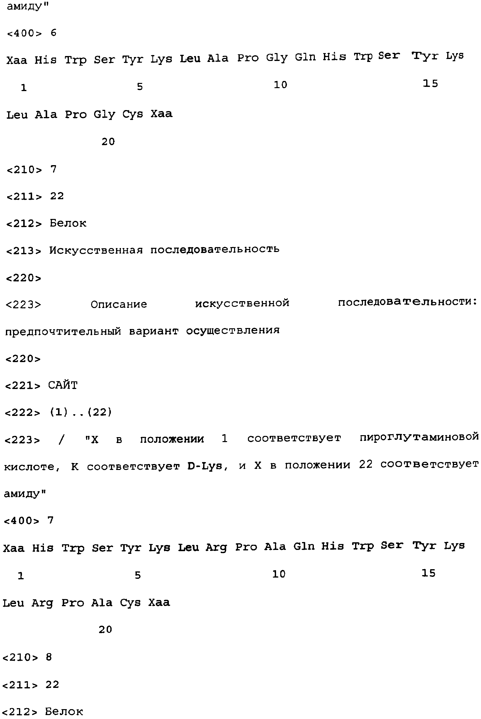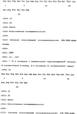 В предпочтительном варианте пептид выбран из группы, состоящей из pEHWAYkLRPGQHWAYkLRPGC# (SEQ ID NO:5), pEHWSYkLAPGQHWSYkLAPGC# (SEQ ID NO:6) и pEHWSYkLRPAQHWSYkLRPAC# (SEQ ID NO:7). Более предпочтительно он выбран из группы, состоящей из pEHWSYkLAPGQHWSYkLAPGC# (SEQ ID NO:6) и pEHWSYkLRPAQHWSYkLRPAC# (SEQ ID NO:7).