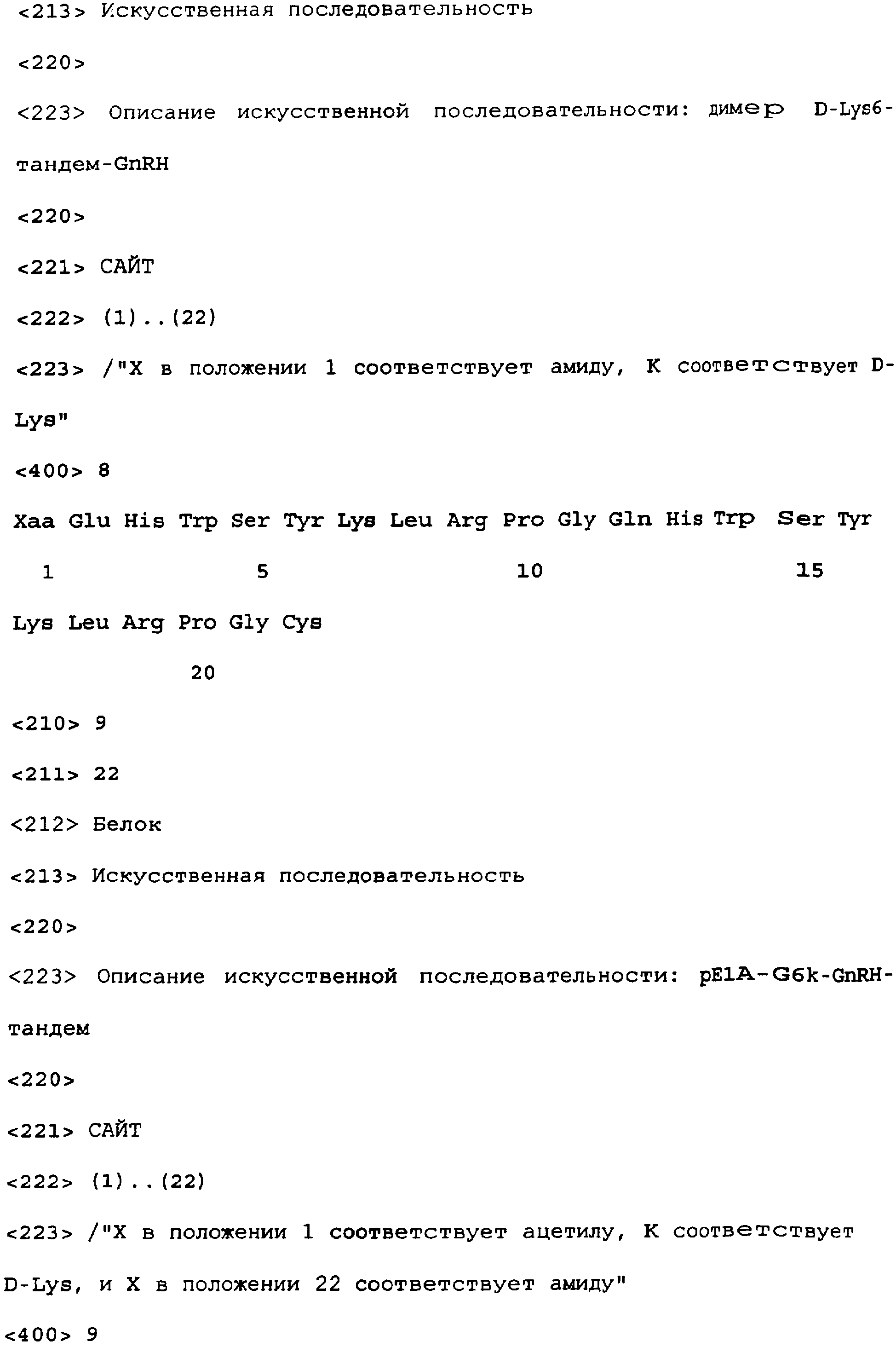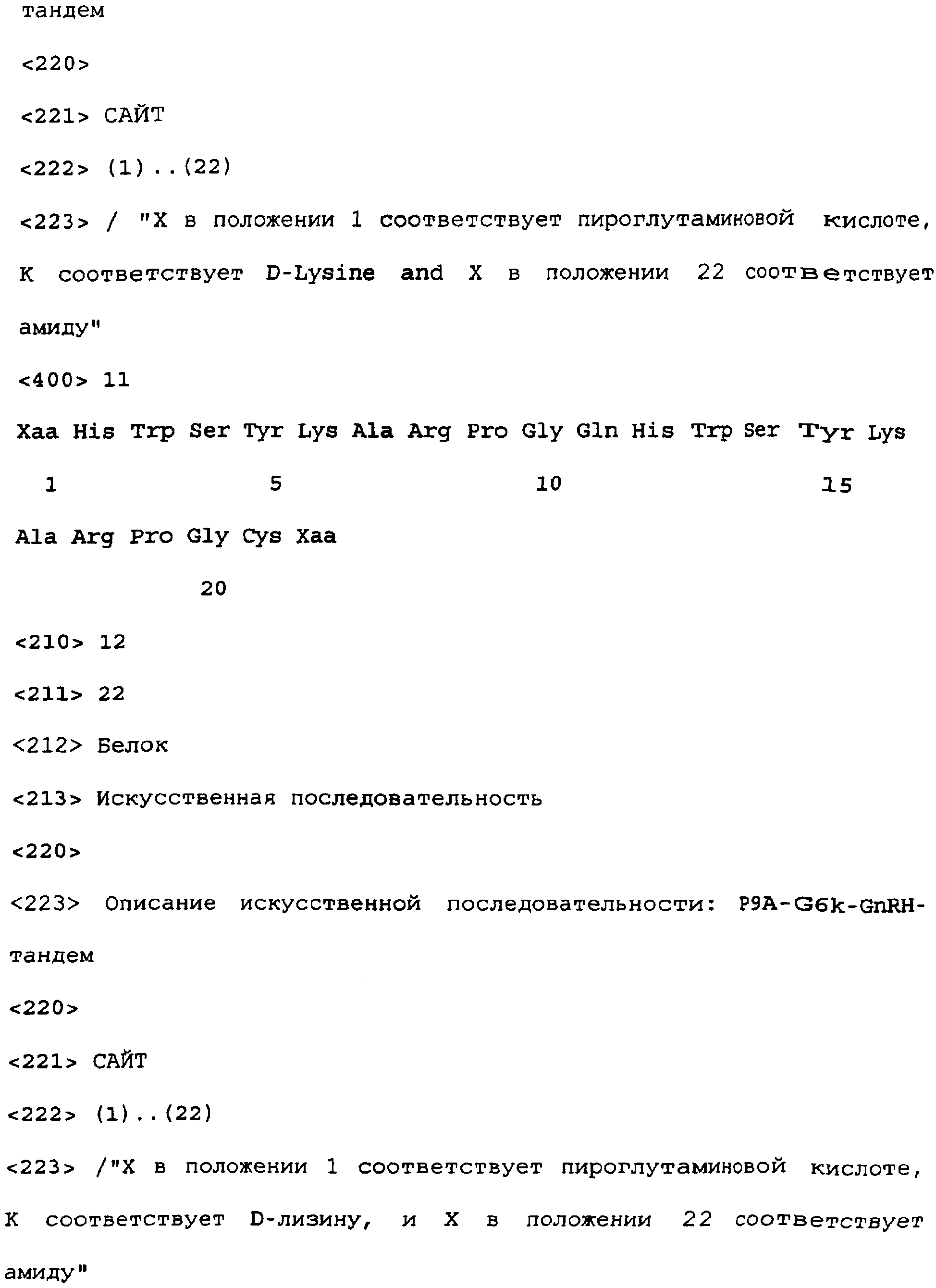 Могут быть использованы способы димеризации и связывания этого тандема с носителем, сходные со способами, описанными в WO 96/40755. Также предполагается, что пептиды, содержащие только часть пептидных последовательностей GnRH-I или GnRH-II, могут быть использованы в данном изобретении. Примерами их являются нонапептиды и ундекапептиды.