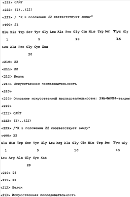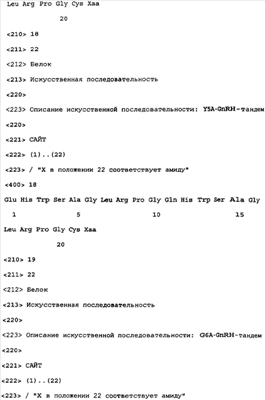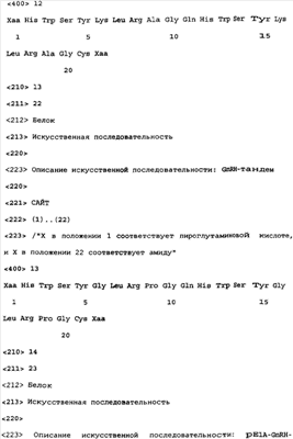 В пептидах согласно данному изобретению димеризация тандемных звеньев может, например, происходить через карбоксильный конец или через амино-конец. Два тандемных звена могут быть, например, димеризованы посредством дисульфидного или простого тиоэфирного мостика. Для димеризации тандемных последовательностей может быть использован Cys в положении 21 или Cys может быть синтезирован перед глутаминовой кислотой в положении 1. Другие способы димеризации или мультимеризации GnRH-тандемных звеньев могут быть также найдены в предыдущем уровне техники. Если Cys в положении 21 участвует в димеризации и, следовательно, недоступен для связывания, можно также использовать другую аминокислоту тандема, которая может быть связана. Если димеризация или мультимеризация приводит к потере доступных сайтов, с которыми может конъюгироваться соединение-носитель, достаточно ограничить выбор заменяющих аминокислот аминокислотой с подходящей боковой цепью. Такой заменяющей аминокислотой может быть, например, L- или D-Lys, L- или D-Glu или другая аминокислота, содержащая боковую цепь, которая делает возможным связывание с соединением-носителем. Как L-, так и D-замены были испытаны, и было обнаружено, что они оказывают одно и то же действие.