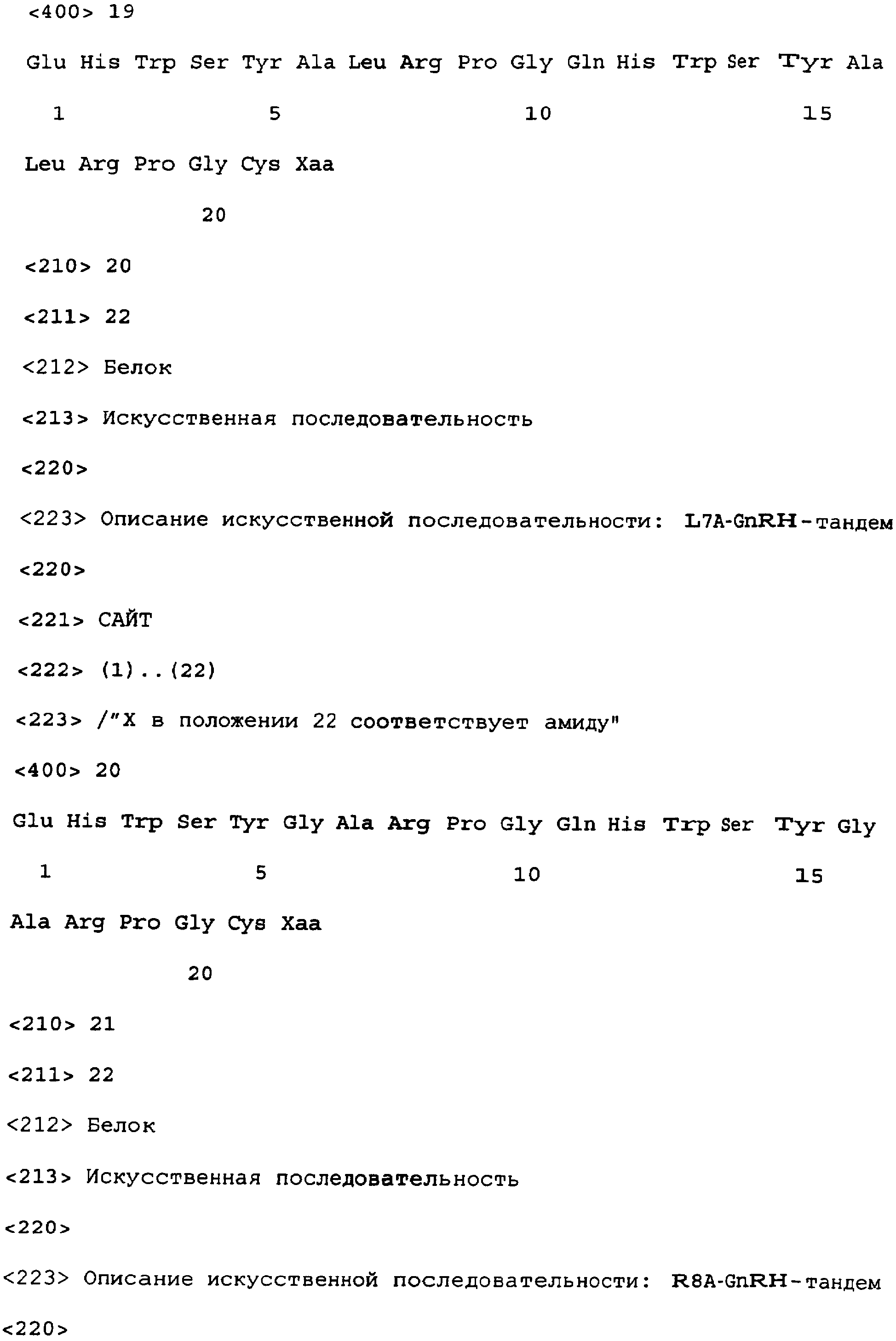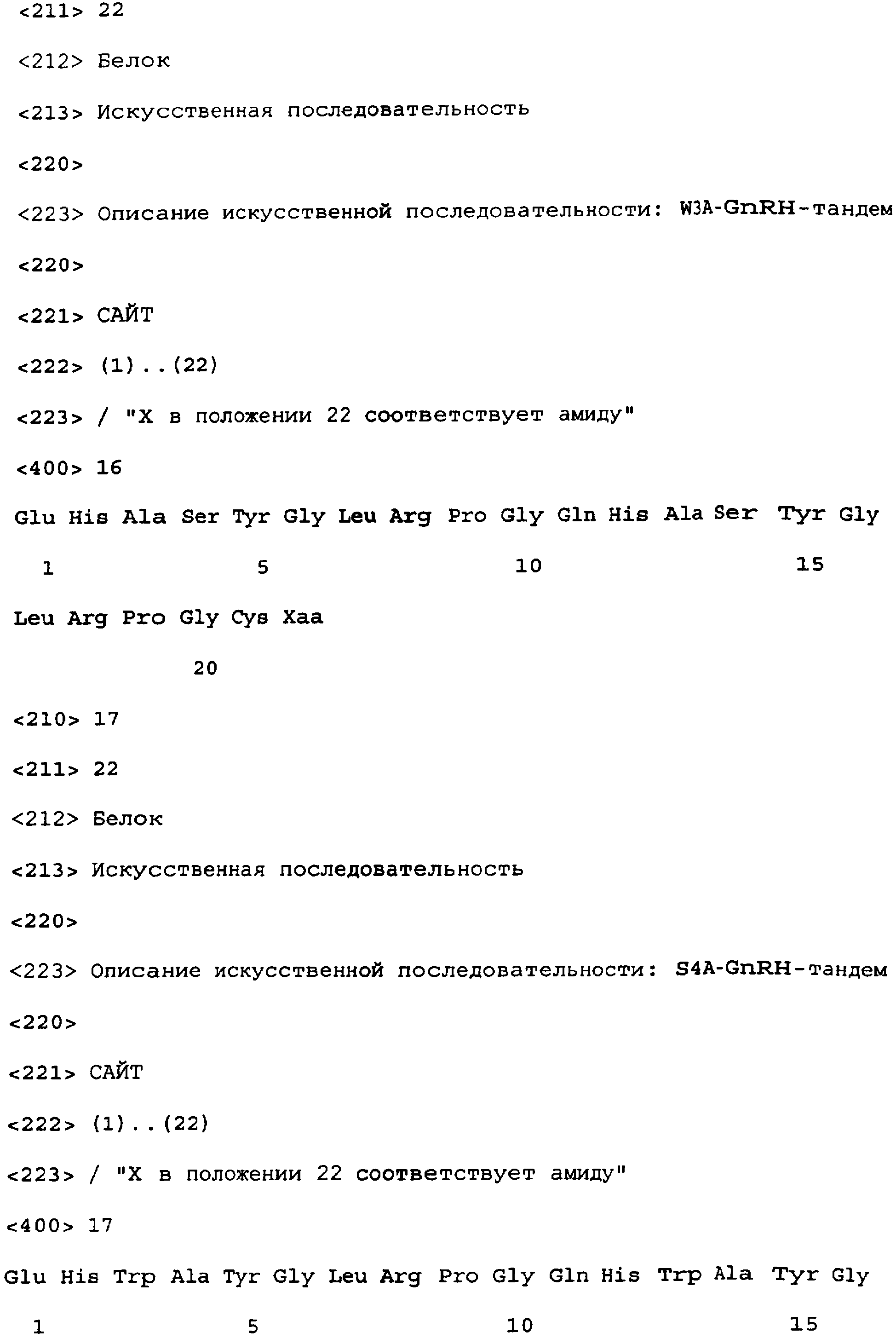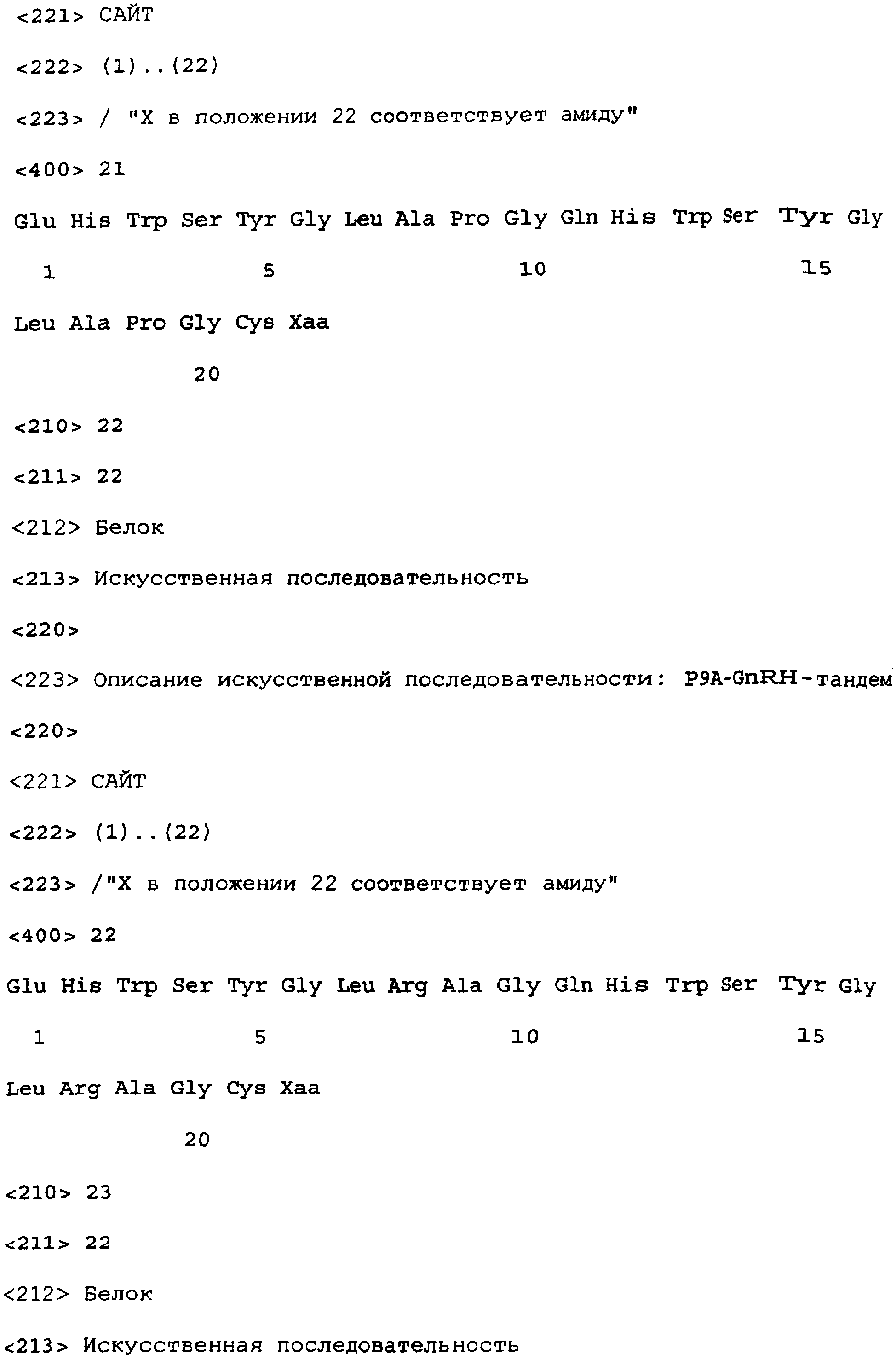 Другие пептиды или пептидные последовательности или связанные пептидные последовательности, в которых присутствуют мономеризованные, димеризованные или мультимеризованные GnRH-тандемные звенья, которые содержат аминокислотные замены, являются также частью данного изобретения.