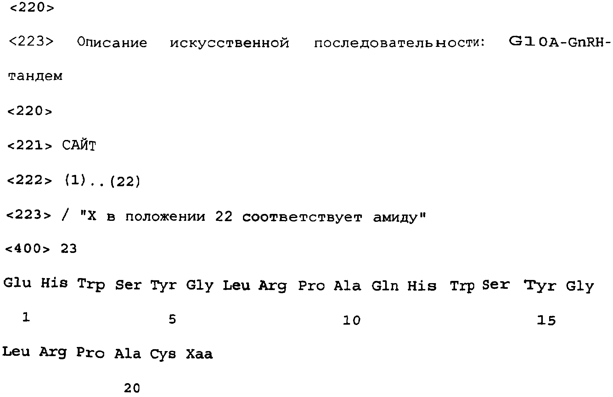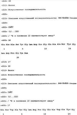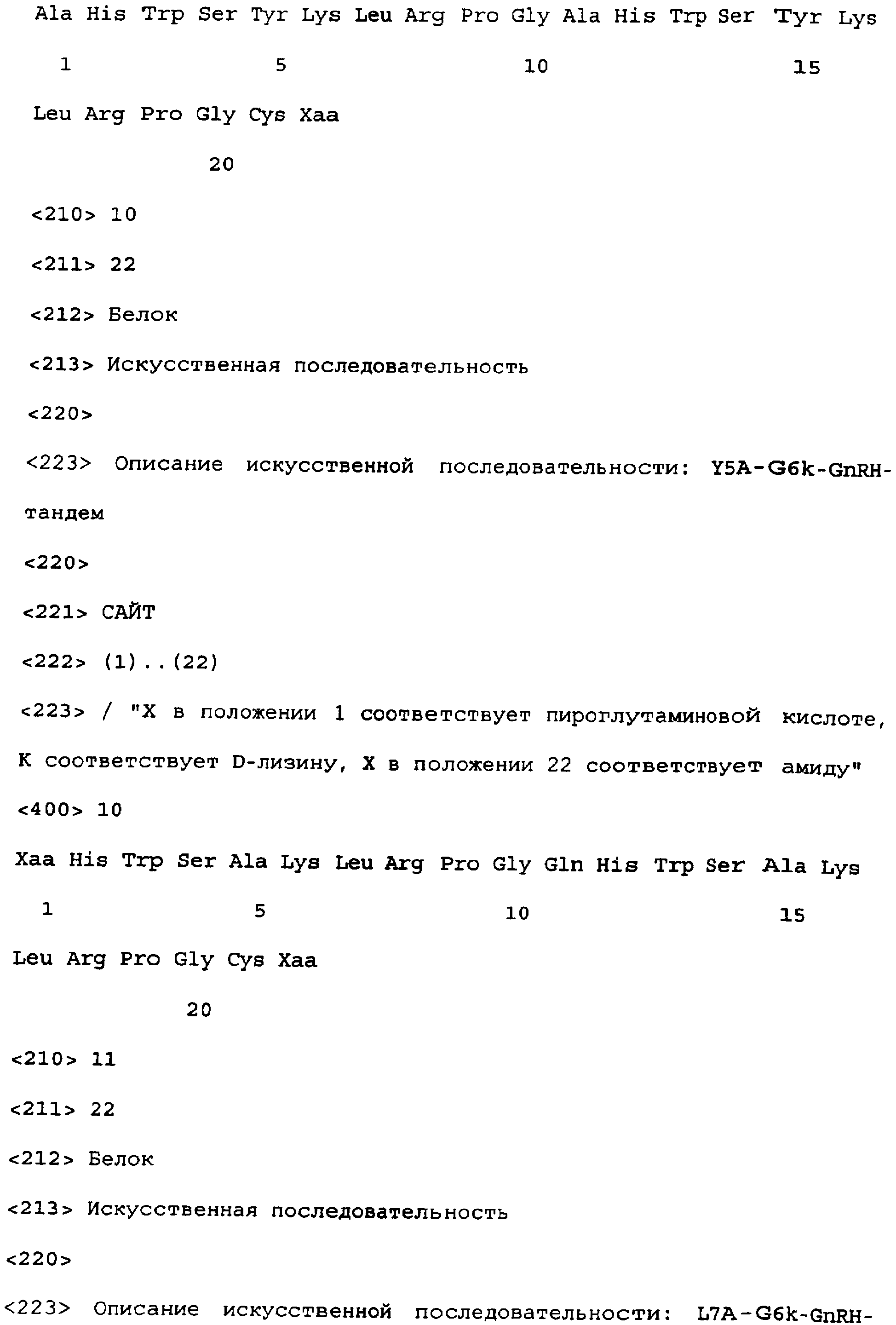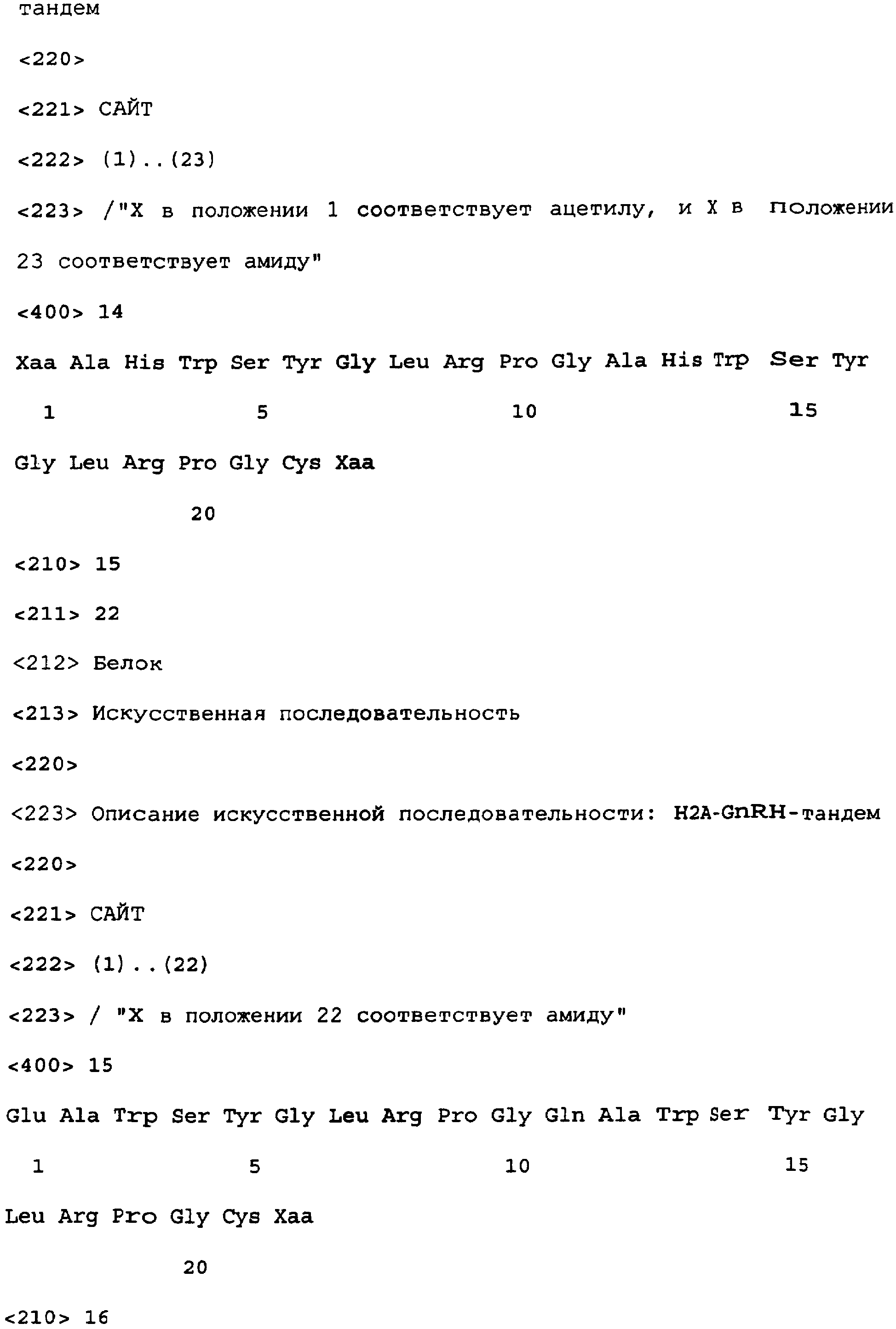 Другие пептиды или пептидные последовательности или связанные пептидные последовательности, в которых присутствуют мономеризованные, димеризованные или мультимеризованные GnRH-тандемные звенья, которые содержат аминокислотные замены, являются также частью данного изобретения.