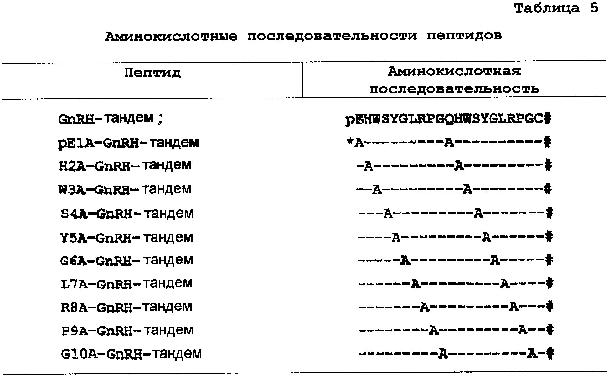 Подобно аланин-сканированию, описанному в примере 1, синтезировали пептиды с заменами аланином аминокислот GnRH-тандемного пептида (таблица 5). Пептиды димеризовали, очищали и конъюгировали с OVA, как описано ранее.
