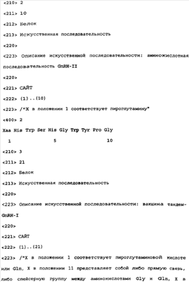 в которой аминокислоты обозначены в соответствии с трехбуквенным кодом, Trp1 и Trp2 являются триптофаном (Trp) или формилированным триптофаном (N(индол)формилтриптофан), n равно числу, имеющему величину по меньшей мере 1, Х является либо прямой связью, либо спейсерной группой между Gly и Gln, Z1-Glx обозначает либо pGlu (пироглутаминовую кислоту), либо Gln, имеющий присоединенный к нему хвост, содержащий одну или несколько дополнительных аминокислот, и Gly-Z2 обозначает либо Gly-NH2, либо Gly, имеющий присоединенный к нему хвост, содержащий одну или несколько дополнительных аминокислот. В этой общей формуле Х может быть прямой связью между аминокислотами глицином и глутамином, т.е. эти аминокислоты связаны друг с другом непосредственно без промежуточного звена (посредством обычной пептидной связи). Изобретение содержащей тандемный GnRH-I вакцины включает в себя также пептиды, в которых последовательности GnRH-I связаны между собой через спейсеры. Природа спейсерной группы может сильно варьироваться, от одной или более аминокислот до более короткой или более длинной цепи и групп или молекул других соединений. В приведенной выше общей формуле Z1-Glx предпочтительно представляет pGlu (пироглутаминовую кислоту), но может представлять также Gln, имеющий присоединенный к нему хвост, содержащий одну или несколько дополнительных аминокислот, например, для использования для связывания этого пептида с белком-носителем. В приведенной выше общей формуле Gly-Z2 обозначает, например, Gly-NH2, или Gly, имеющий присоединенный к нему хвост, содержащий одну или несколько дополнительных аминокислот, например, для использования для связывания этого пептида с белком-носителем. Предпочтительно, Gly-Z2 представляет Gly-Cys-NH2, причем С-концевой цистеин добавляется в связи с возможным связыванием этого пептида с белком-носителем.