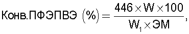 К – поправочный коэффициент, равный 1,1, учитывающий избыток сополимера. Навеску сополимера в виде порошка высыпают на пластину из нержавеющей стали Х18Н10Т с прокладкой из алюминиевой фольги толщиной 100 мкм, разравнивают порошок по ограничителю формы размерами 70×130×0,1 мм, закрывают прокладкой из алюминиевой фольги и массивной пластиной из нержавеющей стали. Форму с сополимером выдерживают при температуре прессования (230-250°С) в течение 15 мин, задают удельное давление 20,0-23,0 МПа и выдерживают форму под давлением в течение 5 мин. После этого форму с сополимером охлаждают под давлением, сбрасывают давление, вынимают ограничитель с пленкой из формы, охлаждают до комнатной температуры и распрессовывают пленку. Получают пленку толщиной 100 мкм с ровной гладкой поверхностью без непроплавов, включений, раковин и других видимых дефектов размерами 70×130×0,1 мм с разнотолщинностью не более 10%. Исследование ИК-спектра сополимерных пленок показывает отсутствие поглощения в области 1840 и 1055 см-1, что указывает на полное удаление из сополимера непрореагировавшего ПФЭПВЭ и отсутствие в его структуре сульфокислотных групп. Последний факт свидетельствует о том, что в процессе эмульсионной сополимеризации и обработки сополимера не происходит гидролиза сульфонилфторидных групп. Эквивалентную массу сополимера (ЭМ) определяют методом ИК Фурье-спектроскопии на прессованных пленках в сульфонилфторидной форме. Измеряют интегральные интенсивности А полос 2704 см-1 (комбинированная частота колебаний -SO2F-группы) и 2363 см-1 (обертон колебаний -CF2-группы). ЭМ вычисляется по формуле: ЭМ=446[1+k(А(2363)-А(2704))/А(2704)], где коэффициент k определяют по эталонным образцам с известной обменной емкостью, определенной титрованием. Измеренная по указанной методике величина ЭМ равна 1010. На основании данных по величине ЭМ, выходу сополимера (W) и количеству ПФЭПВЭ, загруженного в реакционную смесь (W1), вычисляют конверсию ПФЭПВЭ по формуле