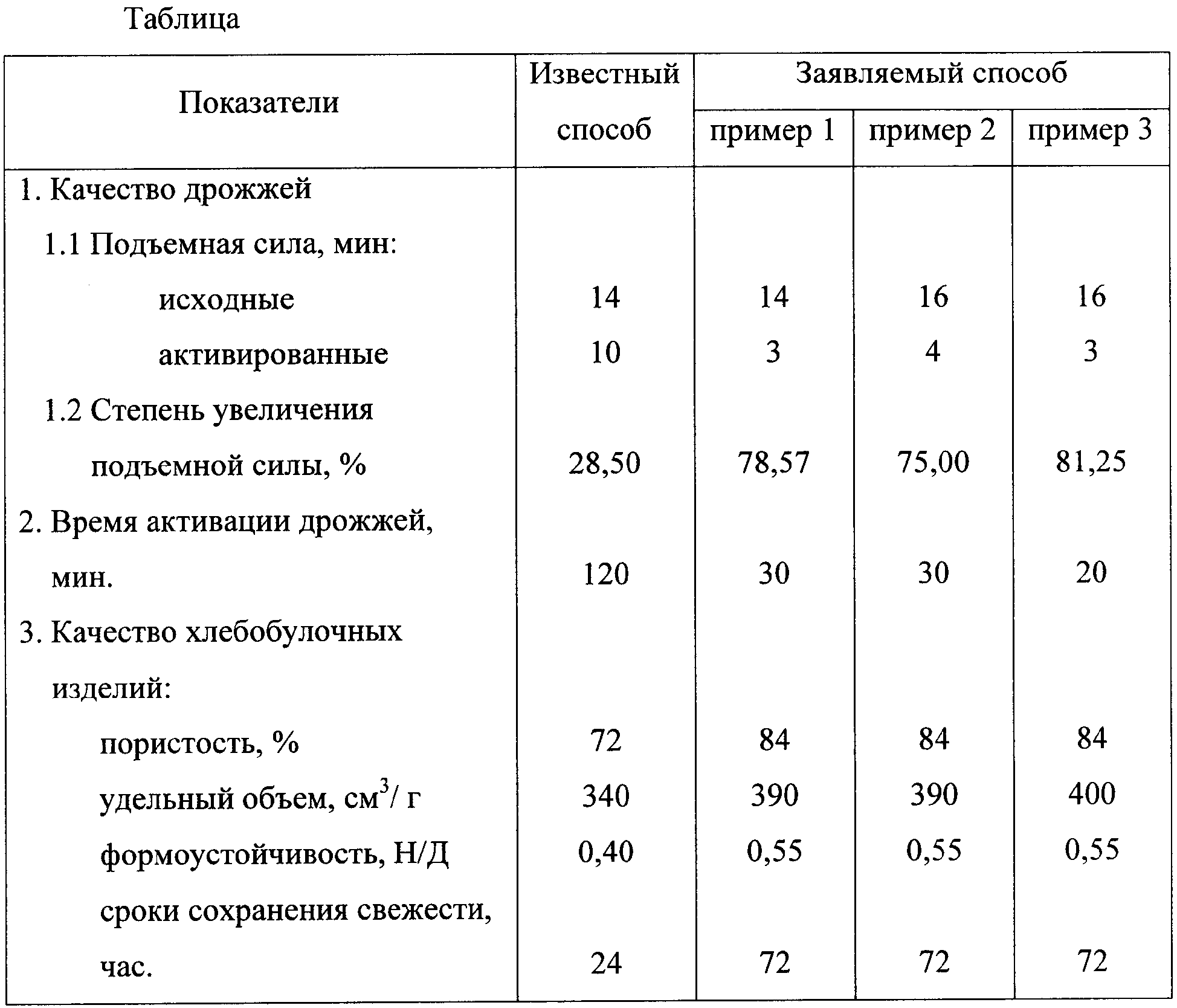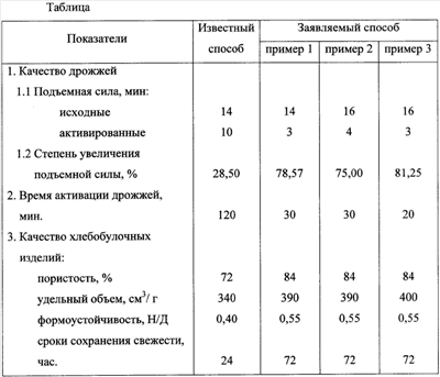 Изобретение относится к пищевой промышленности, в частности к производству хлебобулочных изделий, предназначенных для профилактического питания. Способ включает приготовление питательной среды для активации, внесение в питательную среду измельченных прессованных дрожжей с получением смеси и выдержку смеси. Питательную среду готовят путем смешивания муки, воды и порошка из семян винограда и зерна гречихи. Порошок получают путем измельчения смеси семян винограда и зерна гречихи при соотношении семена винограда: зерно гречихи (1:4)÷(1:9) в тонкой, вращающейся по спирали пленке толщиной 0,1-0,3 мм при давлении 50-70 МПа в течение 5-8 секунд. Количество порошка из семян винограда и зерна гречихи составляет 1-2% к массе муки. Выдержку смеси осуществляют в течение 20-30 минут при температуре 30-32°С. Прессованные дрожжи имеют увеличенную подъемную силу, в результате чего сокращается продолжительность технологического процесса и повышается качество хлебобулочных изделий. 1 табл.