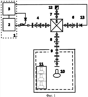Работает установка следующим образом. Сигнал с генератора качающейся частоты 2 с помощью квазиоптического тракта 4 подается на направленный рефлектометр 5, где часть падающей высокочастотной мощности ответвляется в квазиоптический тракт 8 и детектируется с помощью датчика прошедшей волны 13. Продетектированный сигнал поступает на вход индикатора 3 по квазиоптическому тракту 6. Основная часть падающей высокочастотной мощности подается на колбу Эрмлейнера с облучаемой культурой 10, находящуюся при стабилизированной температуре, задаваемой в термостате 9. С помощью согласованной нагрузки 12, в квазиоптическом тракте 7, исключалось переотражение прошедшей волны. Сигнал, отраженный от колбы, по тракту 8 через рефлектометр поступает в тракт 6, где детектируется и поступает на вход индикатора 3. Оба продетектированных сигнала в индикаторе 3 сравниваются. В результате обработки на экране электронно-лучевой трубки индикатора 3 отображается информация о величине вносимого ослабления облучаемой средой. Колба 10 выполнена из материала, прозрачного для электромагнитного излучения. Технические параметры термостата обеспечивают поддержание постоянной температуры с разбросом до 0,25°С в диапазоне от+28°С до+55°С. Для исследования нетепловых эффектов, связанных с воздействием электромагнитного излучения и исключения, в связи с этим влияния температурного фактора на данные эксперимента, точность поддержания температуры в рабочей камере термостата была увеличена до 0,05°С. Рабочая камера термостата представляла собой параллелепипед внутренним размером 395x400x500 мм с проводящими стенками. Квазиоптический программируемый генератор обеспечивает облучение объектов исследования на частотах терагерцевого диапазона, в частности на частоте молекулярного спектра поглощения атмосферного кислорода, 129±2 ГГц. Оконечная часть квазиоптического тракта 8 вмонтирована в рабочую камеру термостата с использованием термоизоляционного материала. Для колбы 10 была изготовлена крышка из тефлоновой пленки толщиной 30 мкм (прозрачной для терагерцевых волн), что позволяло осуществить облучение культуры без контакта с атмосферой. Последнее позволило проводить исследования в условиях гипоксии. Используя принцип раздельного выделения и детектирования сигналов падающей и прошедшей волн, можно было проводить контролируемое облучение культуры на различных частотах в рабочем диапазоне установки и измерять параметры поглощения среды с культурой в колбе 10.