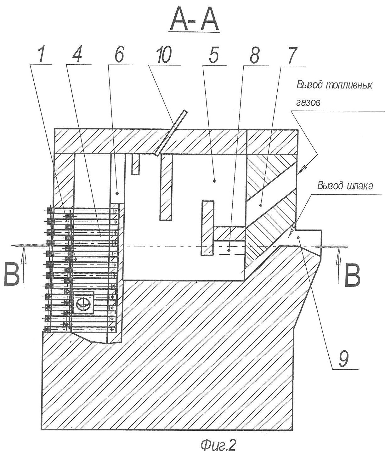 – газлифт 1 с фурмами 2, нисходящим 3 и восходящим 4 каналами шлакового расплава, газоотделительную камеру 5, которая в верхней части соединена каналом 6 с восходящим каналом 4 шлакового расплава в газлифте и имеет газоход 7, переливной сифон 8, канал выдачи избыточного шлака 9 и канал 10 для ввода дутьевой фурмы или горелочного устройства (дутьевая фурма или горелочное устройство на чертежах не показаны);