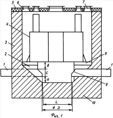 На фиг.1 показан вертикальный разрез печи, а на фиг.2 – схема расположения электродов и опор колокола в плане. Цифрами обозначены: 1 – электрод; 2 – опора; 3 – футеровка; 4 – колокол; 5 – свод; 6, 7 – люки; 8 – изоляционная прокладка; 9 – скошенная грань электрода; 10 – подина. Буквами обозначены: а – расстояние от подины до электрода; b – расстояние от электрода до колокола; с – высота колокола; L – расстояние между электродами; D – диаметр горизонтальной части подины.