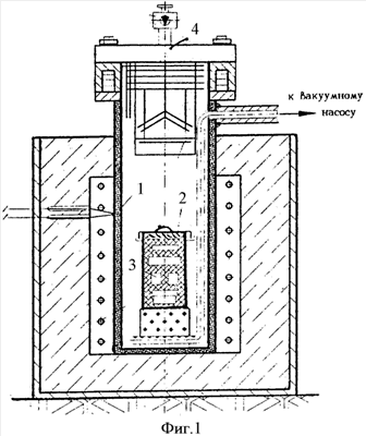 При практическом осуществлении процессов азотонауглероживания использовали модернизированные вакуумные печи СШОЛ-ВНЦ, СНОЛ-ВНЦ с «горячей» ретортой – 1 (фиг.1) из нержавеющей стали 09Х18Н10Т с вакуум-выводом к плунжерному вакуумному насосу. Контейнер 2 с деталями 3 в порошковой засыпке из смеси дробленого древесного угля, карбамида, трилона-Б помещали в реторту, разогретую до температуры первого этапа, через быстросъемную водоохлаждаемую крышку 4. После проведения двухэтапной обработки по предложенному режиму через эту же крышку контейнер с деталями переносили на воздух и охлаждали детали в выбранной среде, извлекая из порошковой упаковки.