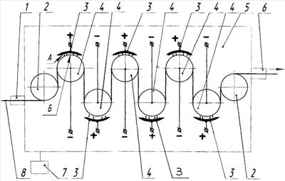 4. Токоотводящие направляющие ролики, снабженные системой охлаждения, токоотводом (катод) и электромагнитной системой бегущих магнитных полей, направленных перпендикулярно с цилиндрической поверхности роликов (не показаны).
