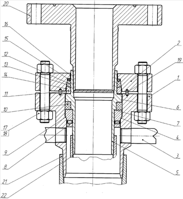 На верхней поверхности фланца корпуса 1 и на нижней поверхности крышки 2 выполнены кольцевые канавки, в которых установлено кольцевое металлическое уплотнение 19.