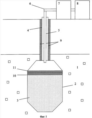 В соответствии с изображением фиг.1 созданный через скважину в каменной соли 1 подземный резервуар 2 заполнен рассолом 3. Скважина оборудована обсадной 4 и подвесной 5 колоннами труб. Подвесная колонна труб 5 посредством наземного трубопровода 6 соединена с блоками подачи 7 и подготовки 8 материалов, используемых в процессе герметизации затрубного пространства 9 скважины подземного резервуара 2. При подаче по подвесной колонне труб 5 пластичного, нерастворимого в рассоле 3 состава на поверхности рассола 3 создается плавающий изолирующий слой 10 из смеси дизельного топлива, глины и карбоксиметилцеллюлозы, взятых в соотношении, соответственно, мас.%: 58:38:4. После образования за счет этого в горловине подземного резервуара 2 пластичной глинистой пробки в виде изолирующего слоя 10, на который затем наносят тампонирующий материал – раствор портландцемента, создающий плотный покрывающий цементный слой 11.