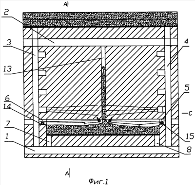 Через восстающий 13 подсечный слой засыпается породой 16, которую скреперными установками разравнивают по подсечному слою, после чего из доставочной выработки 10 в подсечный слой проходятся выработки 17, и порода в объеме воронок выпуска отгружается через каждую выработку выпуска. На этом подготовка днища блока заканчивается (фиг.2).