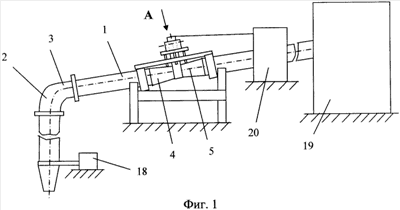 С помощью системы управления режимом подачи 18 осуществляют настройку параметров всасывания и транспортировки из забоя, зумпфа или котлована золотосодержащей песчано-глинистой породы с водой через гидротранспортирующую напорную систему со струйной аэрогидродинамической кавитацией 1. В результате кавитации в изгибах 2 трубы 3, действия давления напора, турбулентности и столкновения частиц между собой происходит пластическая деформация и частичное разрушение породы. С помощью системы управления 20 настраивается и включается система струйной аэрогидродинамической кавитации 6. С помощью завихрителей 7, установленных внутри элемента сужения 4 и выполненных в форме прямоугольных треугольников 16, острые углы 17 которых ориентированы по ходу основного направления движения гидропотока 10, изменяется структура гидропотока, энергетическое, теплофизическое и упругореологическое состояние элементов горной массы. При переходе к зоне 12 элемента расширения 5, в момент увеличения скорости потока, возрастают области понижения давления до некоторого критического давления ркр. Включается система струйных сопел 9. Через струйные сопла 10, установленные с двух сторон 8 между элементом сужения 4 и элементом расширения 5, с врезкой струйных сопел 10 в стенку 13 элемента расширения 5, с обеспечением герметичности посредством уплотнительных колец 14, осуществляется подача воздуха по ходу основного направления движения гидропотока 11 в зоне 12 элемента расширения 5. Радиусные направляющие 15, установленные перед струйными соплами 10, обеспечивают плавный переход режима течения. Струйная, с переменным давлением, подача воздуха обеспечивает его равномерное распределение. Это способствует росту числа воздушных кавитирующих пузырьков и увеличивает эффект кавитации. С помощью завихрителей 7, установленных внутри элемента расширения 5, острые углы 17 которых ориентированы на встречу основному направлению движения гидропотока 11, создается турбулентность. Это способствует понижению давления внутри жидкости и увеличению числа кавитирующих пузырьков. Разрушенная до микронных размеров глинистая порода подается к системе глубокой переработки 19.