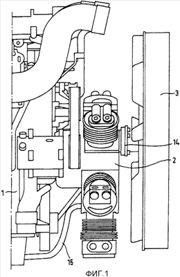 Кроме того, расположение звездообразного двигателя непосредственно позади рабочего колеса 3 вентилятора или между рабочим колесом 3 вентилятора и двигателем 1 внутреннего сгорания предоставляет возможность особенно экономящего места расположения дополнительного расширительного устройства.
