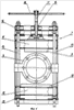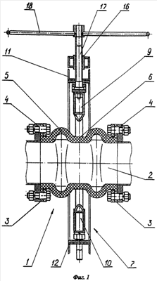 Например, в плоскости пережима (продольной горизонтальной плоскости) удлинение стенки патрубка 2 между его фланцами 3 в осевом направлении происходит интенсивней, чем в плоскости действия нажимных элементов 9, 10 пережимных траверс 11, 12 механизма 7 пережима (продольной вертикальной плоскости).