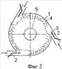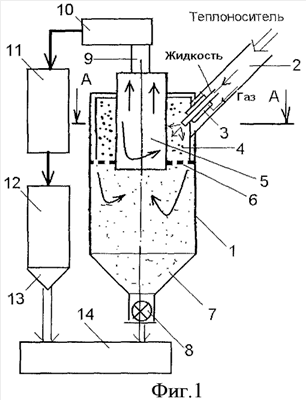 В процессе сушки инертному носителю сообщают вращательное движение направленными потоками газообразного теплоносителя, поступающего из сопел 2. Под действием центробежной силы инертные частицы носителя прижимаются к стенке корпуса 1 и образуют в нем равномерное вращающееся кольцо (фиг.2) между поверхностями корпуса 1 и перфорированной решеткой 6. Высушиваемый раствор напыливается форсунками 3 на частицы инертного носителя 4 высушивается на них, отделяется от их поверхности и выносится потоком отработанного теплоносителя через газоход 5, при этом часть частиц высушиваемого раствора поступает в бункер 7 и через затвор 8 на транспортер 14 (например, в виде пневмотранспорта).