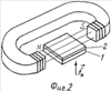 На фиг.2 показано, как ориентируется в изображенных тонкими линиями силовых линиях магнитного поля электромагнита с сердечником в форме буквы «О» с прорезью (зазором) пластина из сверхпроводника 1 с магнитным экраном 2 для обеспечения нескомпенсированной силы , действующей на свободную от магнитного экрана плоскую поверхность сверхпроводника в направлении магнитного экрана.