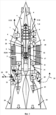 Сверхзвуковой газотурбинный двигатель 4 состоит из сверхзвукового воздухозаборника 5 с центральным обтекателем конической формы 6, компрессора 7, состоящего, в свою очередь, из статора компрессора 8 и ротора компрессора 9, камеры сгорания 10 с форсунками 11, к которым подключен топливопровод 12 с топливным насосом 13, имеющим привод насоса 14. За камерой сгорания 10 установлена турбина 15, содержащая сопловой аппарат 16 и рабочее колесо турбины 17. На выходе турбины 15 установлены четыре сверхзвуковых реактивных сопла 18 с коническими обтекателями 19. На валу 20 установлены все узлы ротора, а именно ротор компрессора 9 и рабочее колесо турбины 17. Все остальные узлы газотурбинного двигателя 4 образуют статор 21, в который входят сверхзвуковой воздухозаборник 5, статор компрессора 8, камера сгорания 10 и сверхзвуковое реактивное сопло 18. Система управления содержит бортовой компьютер 22, соединенный с контроллером двигателя 23, который соединен с приводом насоса 14. Система управления содержит контроллер управления 24 и приводы конических обтекателей 25, которые механически соединены с коническими обтекателями 19.
