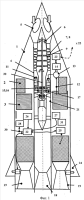 К бортовому компьютеру 22 может быть подсоединено приемно-передающее устройство 28 (фиг.2), к которому подсоединена антенна 29. Антенна 29 имеет кольцевую форму, а участок корпуса 1 в районе расположения антенны 29 выполнен радиопрозрачным. Все связи между электронными компонентами системы управления выполнены проводными 30.
