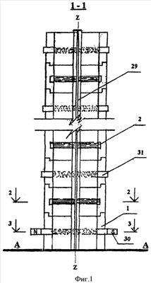 3. На горизонтальной поверхности А-А (фиг.1) размещают сборные элементы 1 и скрепляют их ленточными замками. В образованную линейную форму в сборе высотой h устанавливают пространственную многокомпонентную розетку тензорезисторов крестообразного поперечного сечения 29, выполненную, например, в виде цепочки трехкомпонентных малобазных тензорезисторов, расположенных на основе на заданных расстояниях и обеспечивающих измерения пространственных составляющих главных деформаций ( х, у, z) по сечению объекта в заданных точках.