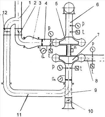 Схема реализации данного способа содержит входной трубопровод 1 с заслонкой 2, камеру сгорания 3 с посторонним источником воздуха (на схеме не показан). Камера сгорания 3 соединена посредством трубопровода 4 с турбиной 5 испытуемого турбокомпрессора. Турбина 5 турбокомпрессора сообщена с атмосферой через выходной трубопровод 6. Трубопроводы 4 и 6 снабжены устройствами для замера давления, температуры, расхода газа. Компрессор 7 турбокомпрессора, его выходной трубопровод 8, соединяющий с атмосферой, также сообщен с атмосферой через входной трубопровод 9 компрессора 7 с регулируемой заслонкой 10, трубопровод 11 для подачи сжатого воздуха к компрессору, регулируемая задвижка 12 на трубопроводе подачи сжатого воздуха. Трубопроводы 9 и 11 снабжены устройствами для замера давление, температуры, расхода воздуха. Ротор турбокомпрессора оснащен датчиком частоты вращения.